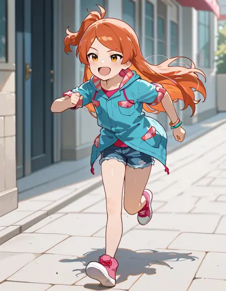 Clothes: blue jacket, hooded jacket, short sleeves, pocket, bracelet, denim shorts, short shorts, sneakers, pink footwear,