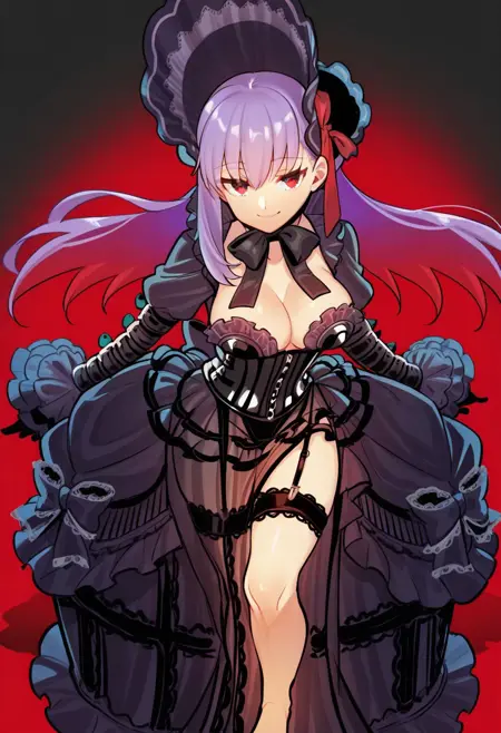 black frilled bonnet, black bowtie, cleavage, corset, long sleeves, juliet sleeves, arm belt, arm wrap, black gloves, frills, black frilled dress, long dress, see-through skirt, side slit, garter straps, thigh straps,