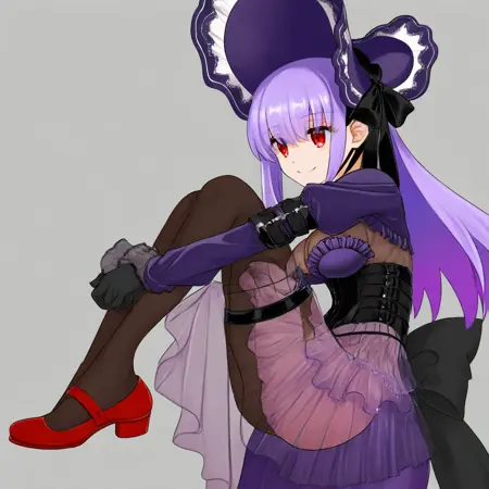 bbfate, purple hair, long hair, red hair ribbon, red eyes, medium breasts,