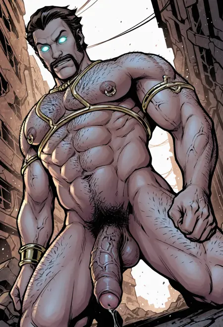Vartox, mature male, brown hair, blue sclera, Luminous sclera, no pupils, Moustache, body hair, Gold jewelry, Golden arm rings, golden nipple rings,