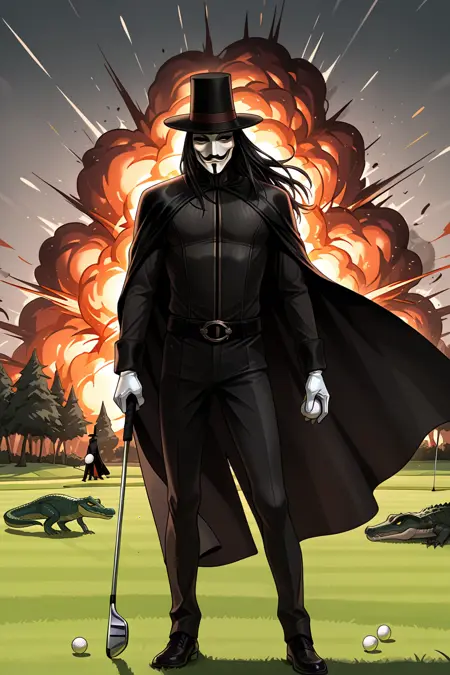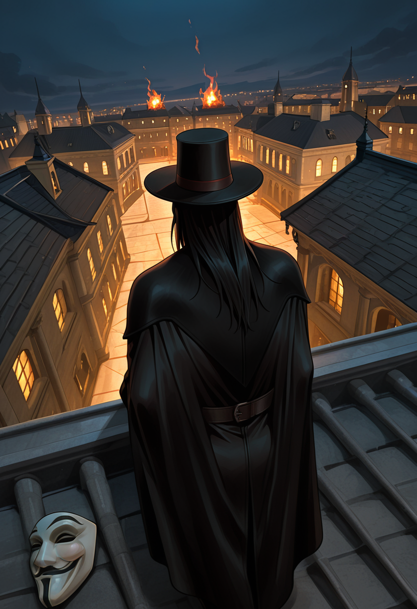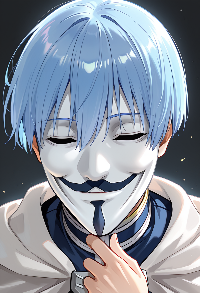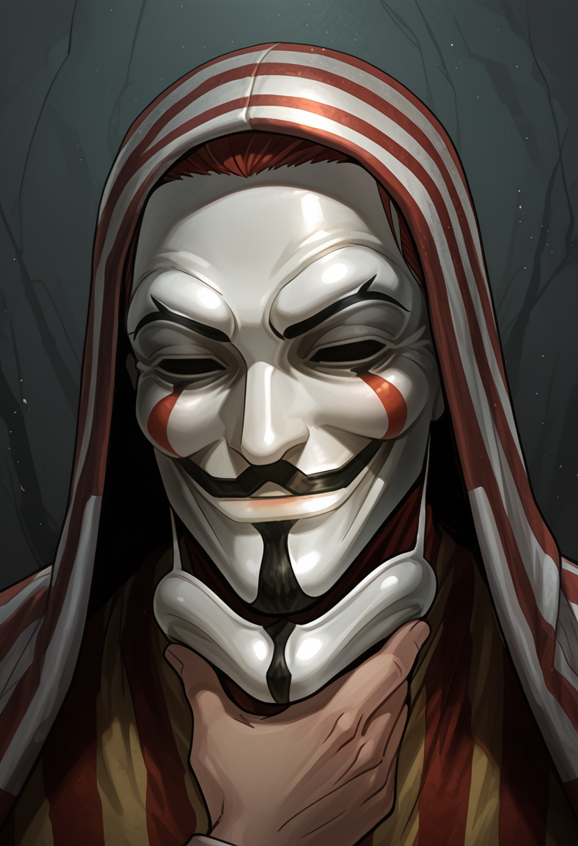 이것은 『V 포 벤데타』에서 등장하는 고이 페우크 마스크를 그림으로 학습시킨 컨셉 LoRA입니다. 해당 만화/영화의 주인공과 유사한 옷차림도 생성할 수 있습니다. 마스크를 얼굴에 착용한 캐릭터를 생성할 때는 "masked" 태그를 사용하고, 눈이나 표정을 설명하는 태그는 제외하세요. 마스크를 통해 눈이 보이는 경우, "covered eyes"나 "no eyes"와 같은 태그를 사용하여 눈이 보이지 않도록 하세요.