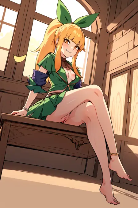 Even if you don't use it for the character, I happen to like the aesthetics regarding colour, outlines etc so it can be nice to play around with. If so: add, "green hair bow, bangs, orange eyes, blonde hair, long hair, (armor, ponytail, shoulder pads), parted bangs, small breasts " to negatives.