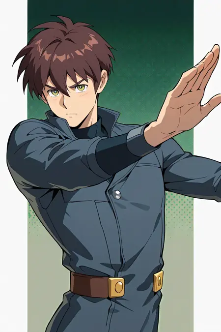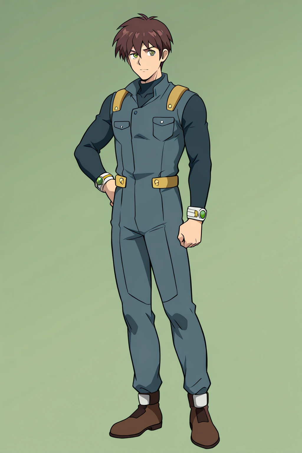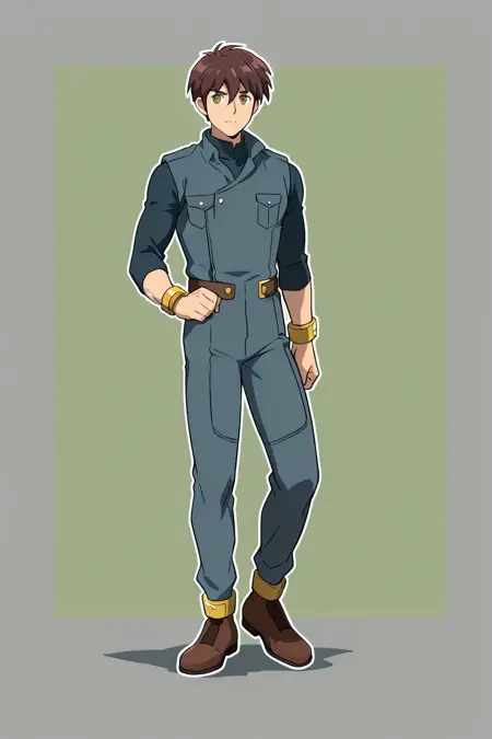 LeonSX, 1boy, short brown hair, dark blue jumpsuit, brown shoes, beige-green eyes