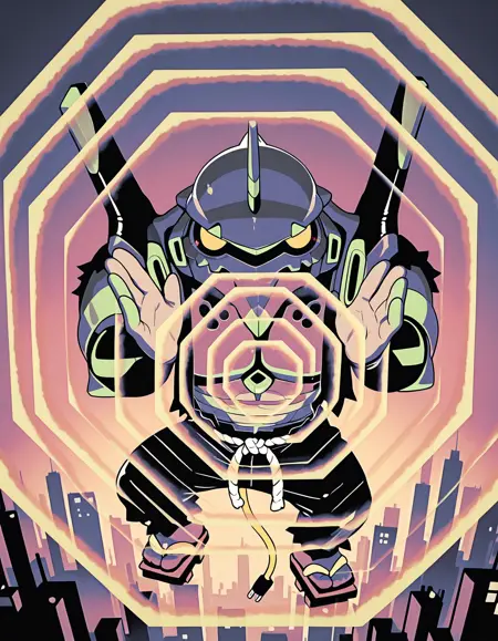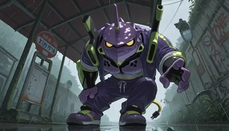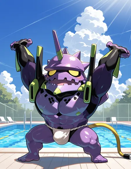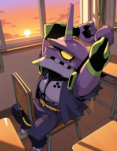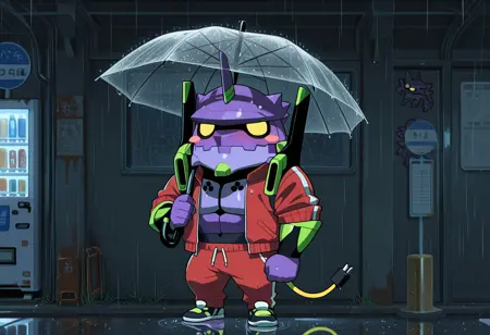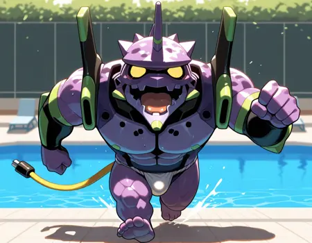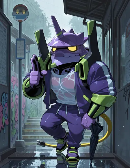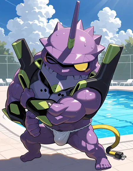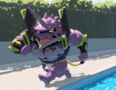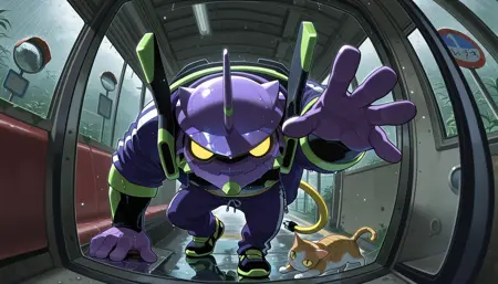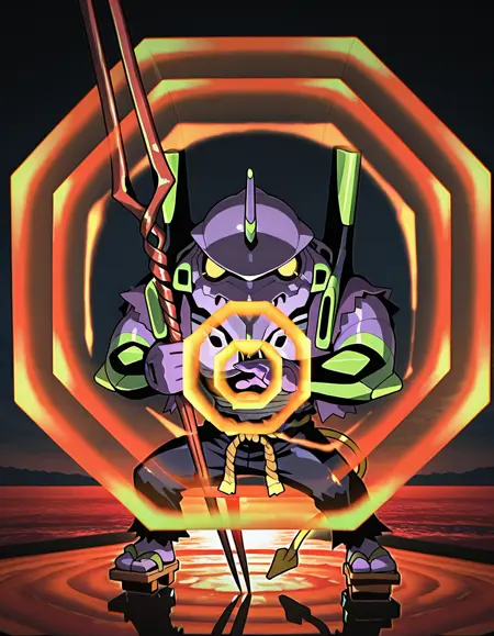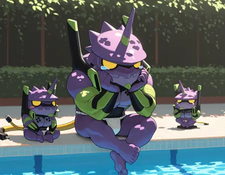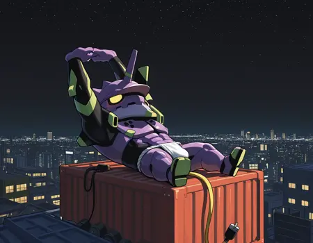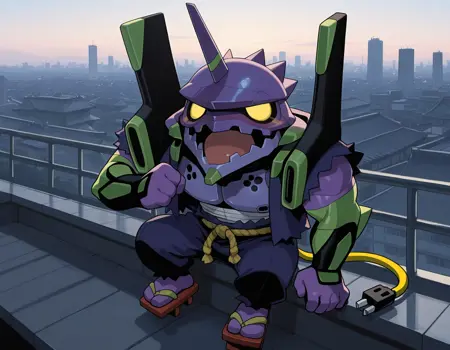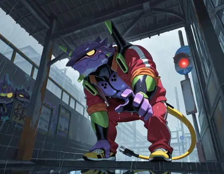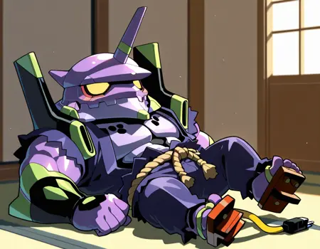 Trigger words: evancho, eva 01, mecha, chibi, yellow eyes, no pupils, electric plug yellow tail