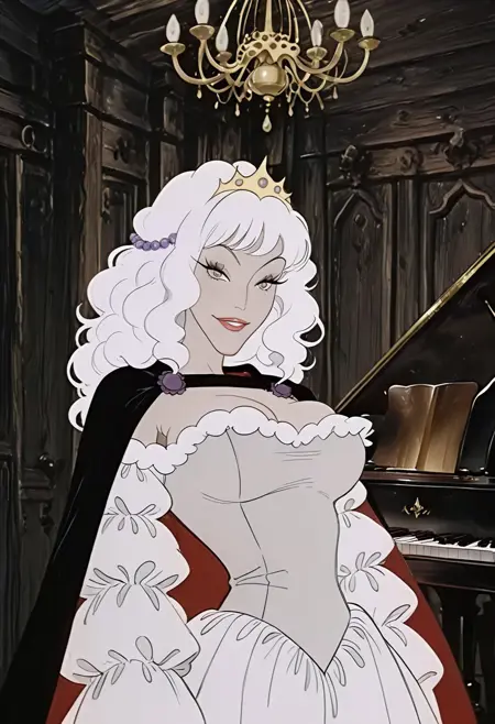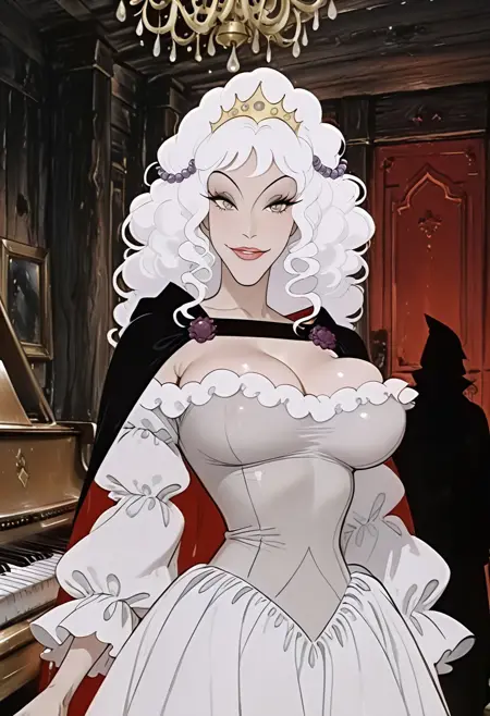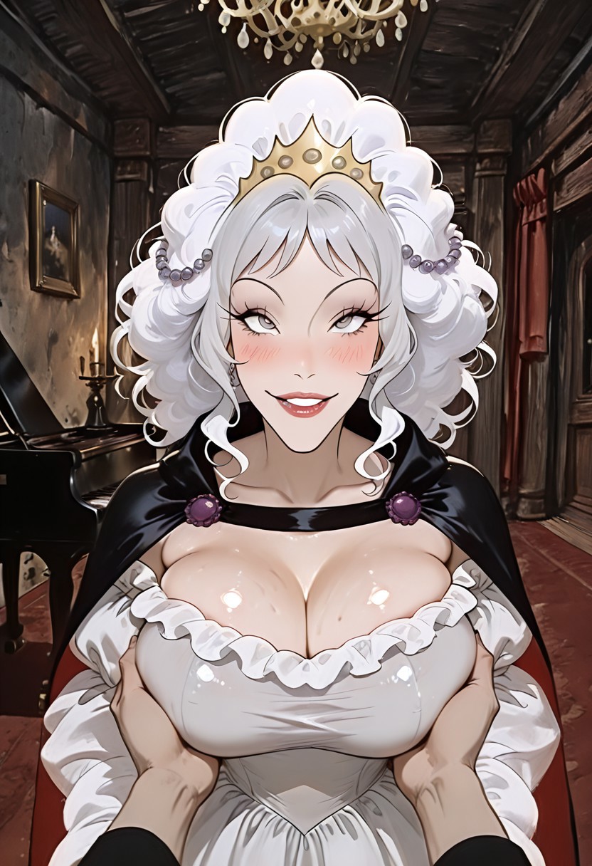 漂亮的波浪状长白发,刘海,镶红宝石的金色发带,紫色珍珠头饰链,内衬红色的黑色斗篷,美丽的性感露肩长袖白色连衣裙,带白色蓬松边缘,诱人深沟,巨大胸沟,美人痣,紫色眼影,长睫毛,红唇,