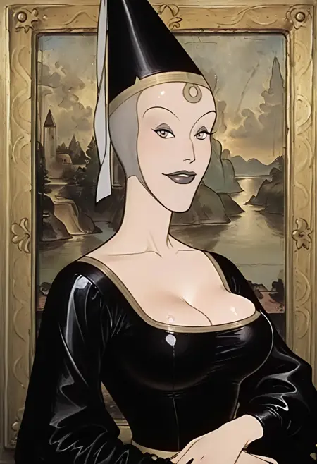 金冠,金色边缘的露肩长袖黑色连衣裙,米色中世纪上衣配米色开放式兜帽,