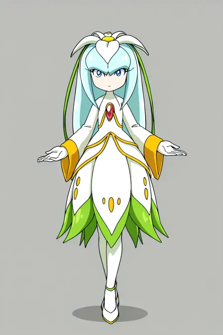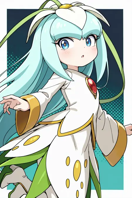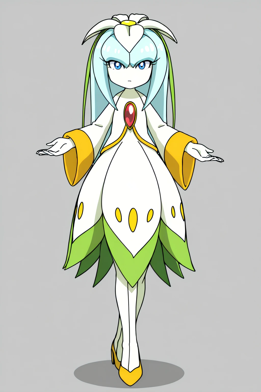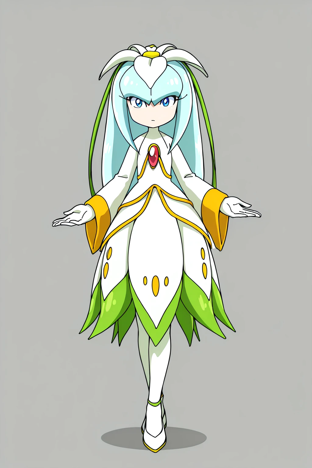 EarthiaSX, 1girl, blue eyes, light blue hair, cream colored skin, white petal dress, light blue high heels, plant girl, flora fauna, long white flower-shaped skirt, red gem in chest