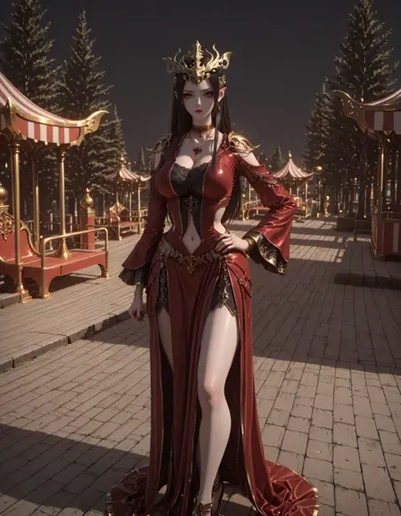 red dress,gold armor,crown,jewelry.For best results, use a weight between 0.7 and 0.9.