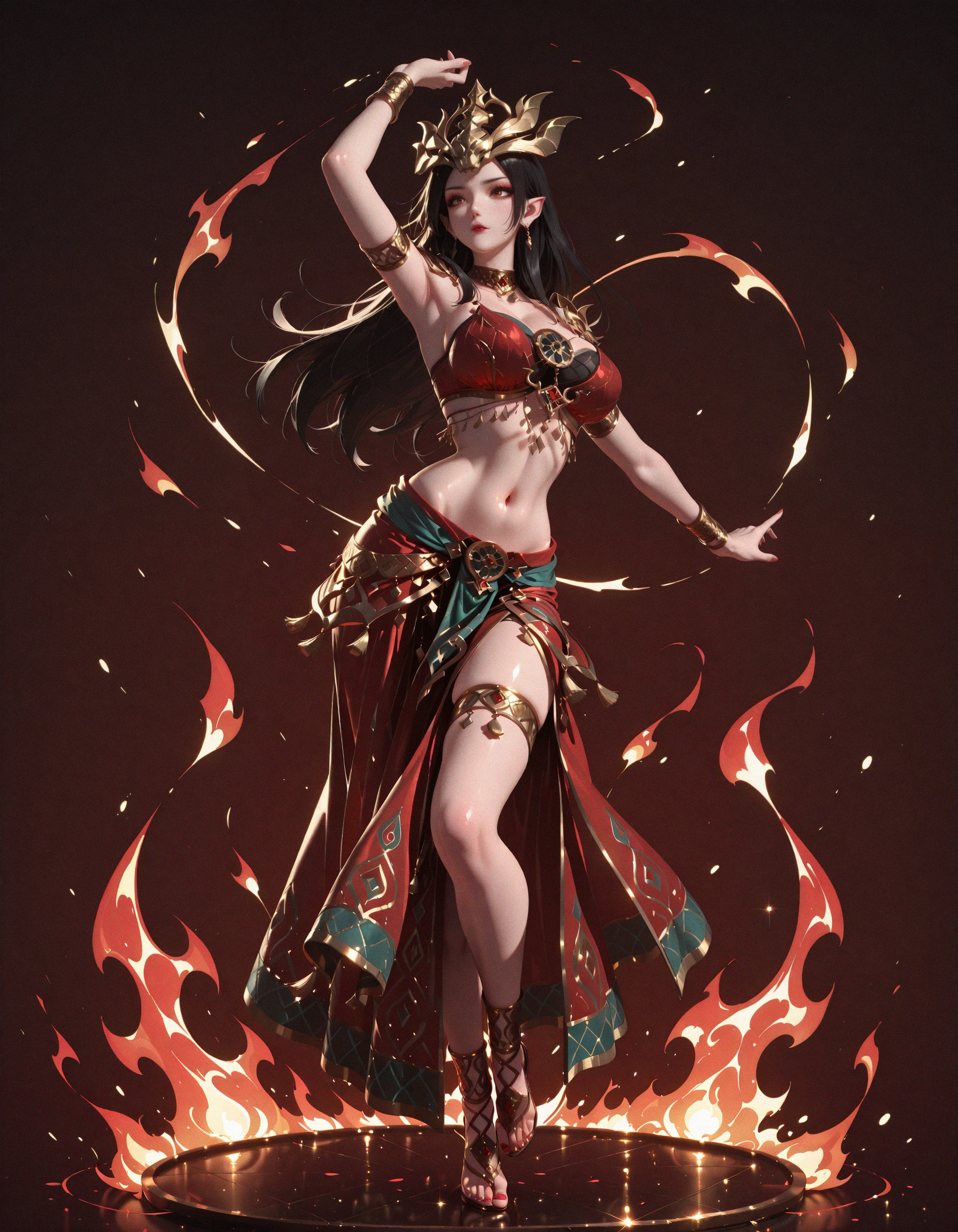 cai lin medusa, snake tribe outfit, belly dancer outfit, red crop top, bare midriff, crown, long black hair, 1girl, solo, jewelry, navel, breasts, full body, dynamic angle, pointy ears, red skirt,