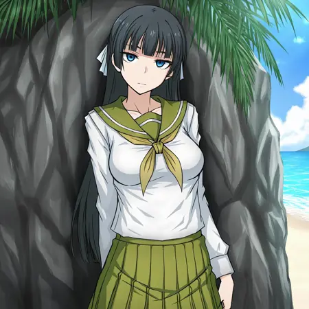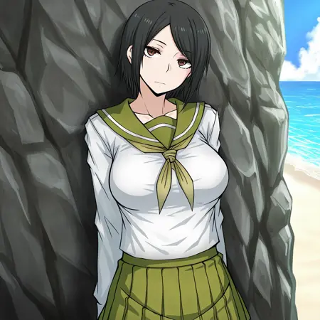 衣装1: セーラー服、緑のスカート、プリーツスカート、ネッカチーフ、ロングスリーブ