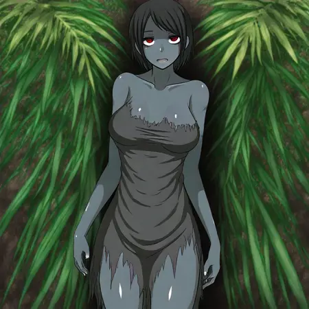 ゾンビ化: 灰色の肌、赤い目、ゾンビの少女、小さな瞳