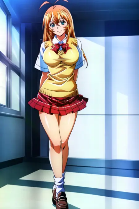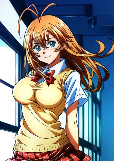 Hakufu Sonsaku, 1girl, skirt, solo, orange hair, long hair, green eyes, yellow eyes, glowing eyes, gloves, earrings, red skirt, red fingerless gloves, jewelry, magatama earrings, red pleated skirt, breasts, looking at viewer, shirt, hand on hip, white shirt, large breasts, school uniform, bow, red bow, short sleeves, tan sweater vest, hair between eyes, red plaid skirt, bowtie, shiny, miniskirt, plaid, ahoge, bangs, antenna hair, shaded face, serious, smirk