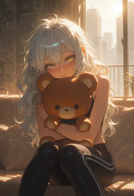 head rest, head tilt, hand on own cheek, rubbing eyes, hand on own face, hugging stuffed animal, hugging teddy bear, arm behind head, hands in pockets, object hug, smoking cigarette, holding mug, smoke