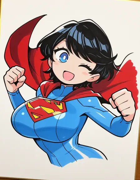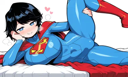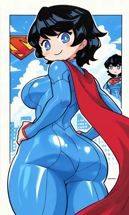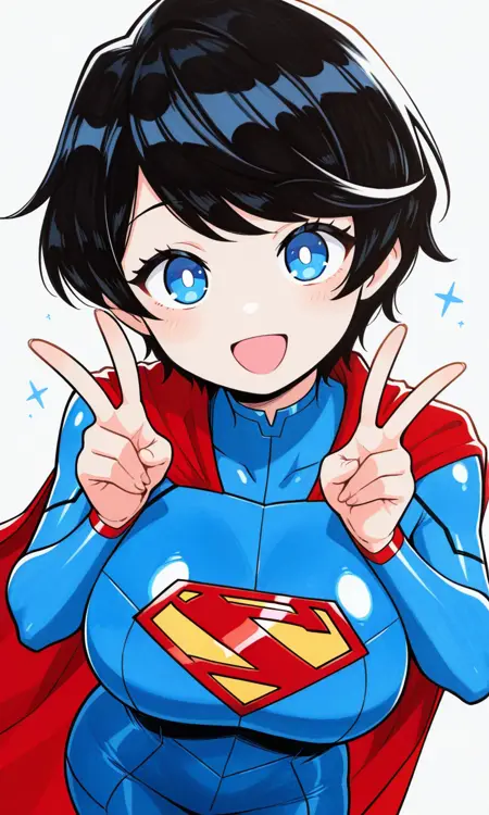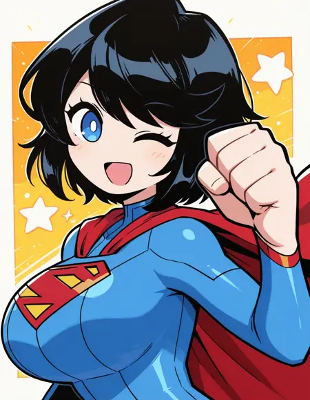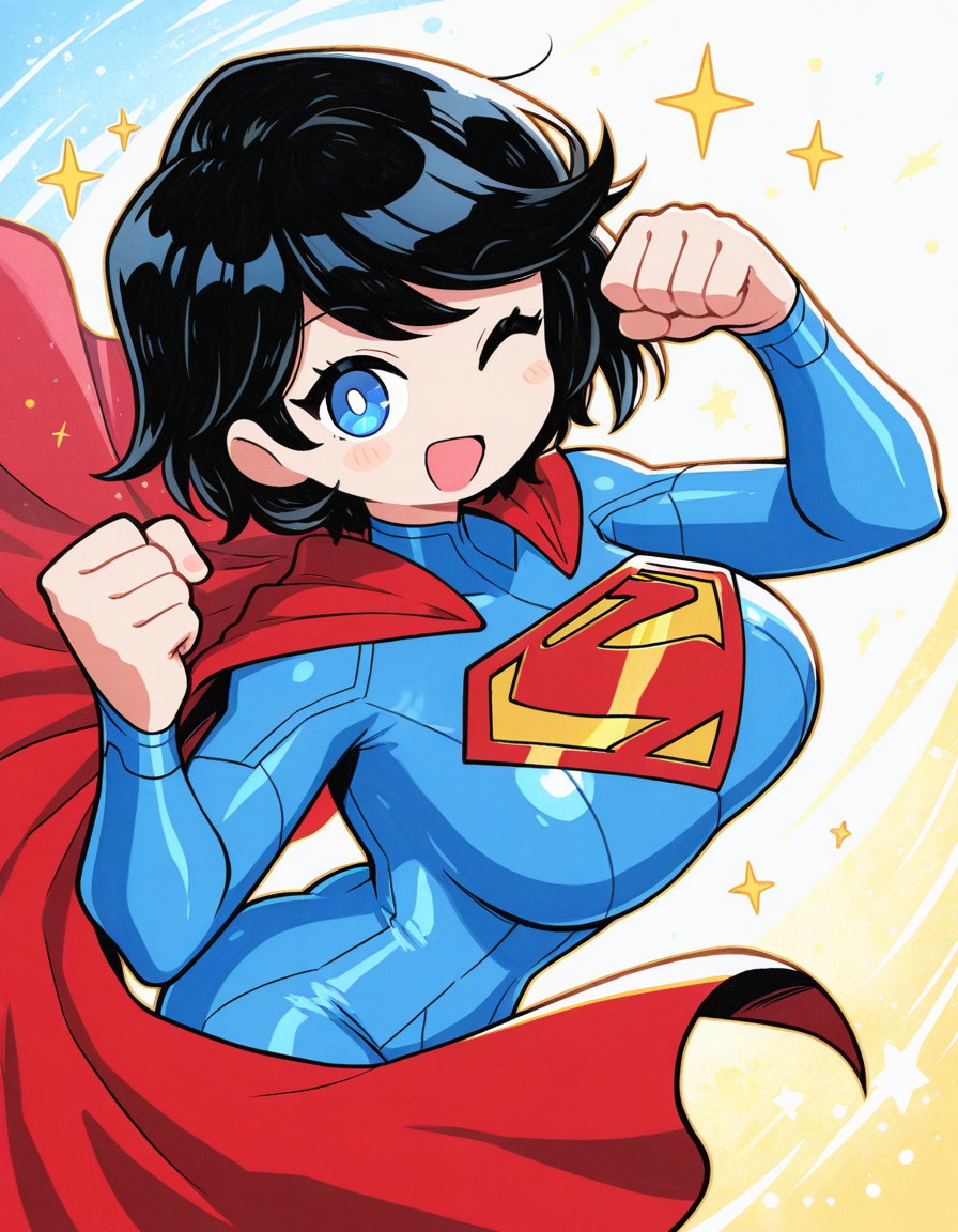 ClaraKent, short hair, black hair, swept bangs, blue eyes, bright pupils, no nose, blue bodysuit, red cape, superman logo, red boots,