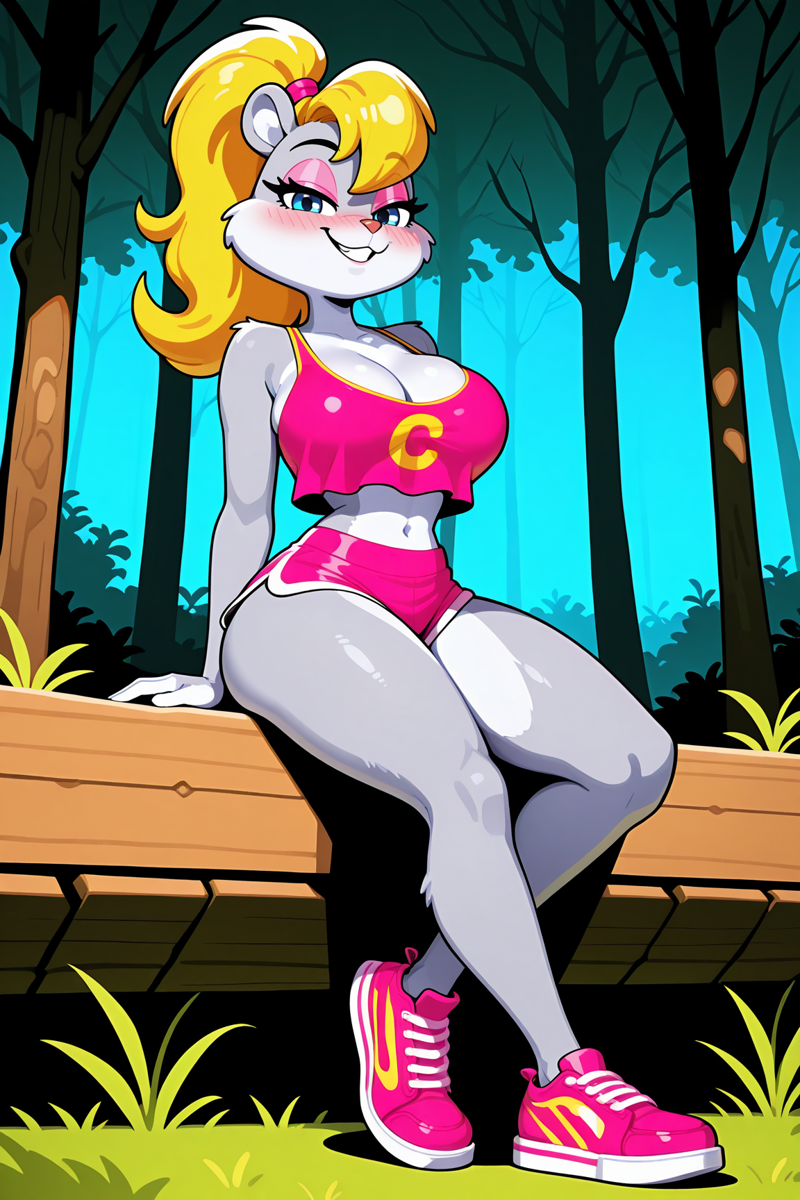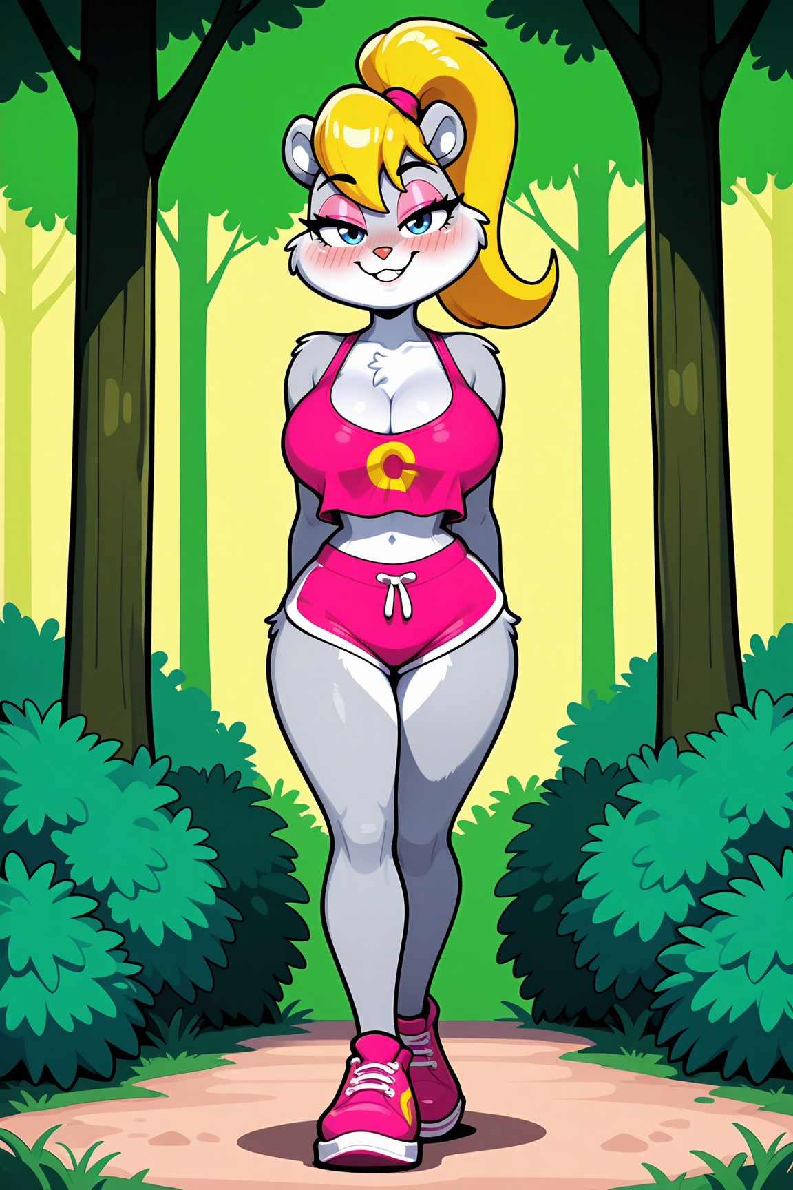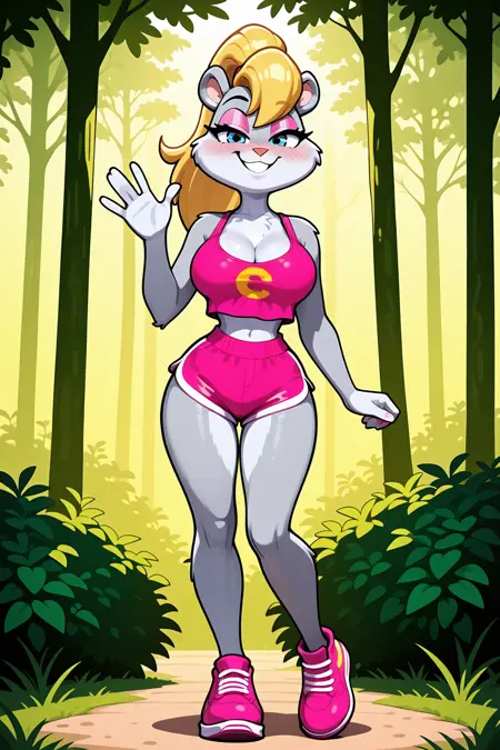➜ BerriCBFDILXL, anthro furry, furry female, body fur, grey fur, grey body, pink eyeshadow, blue eyes, blonde hair, long ponytail, bangs, animal ears, large breasts, cleavage, pink crop top, pink shorts, short shorts, pink shoes