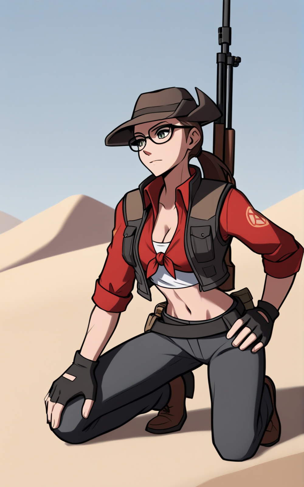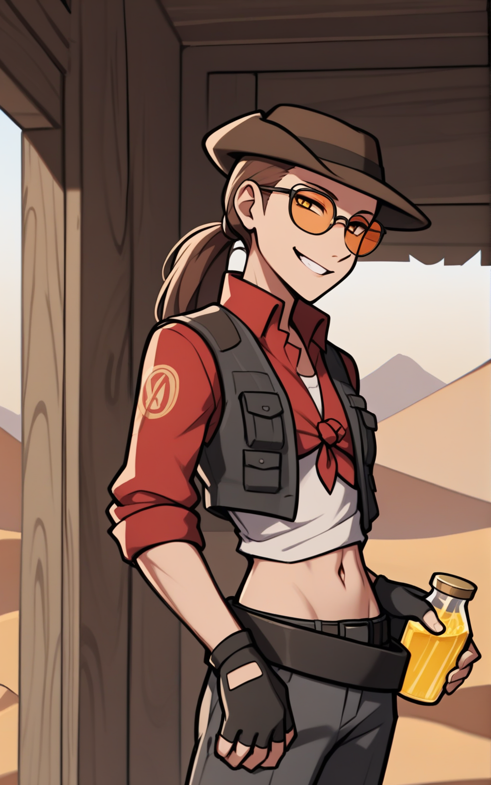 Reinforcement Tags: ponytail, brown hairFor her Outfit:** front-tie top shirt, brown footwear, grey pants, grey vest, brown headwear, shoes, pants, belt, pouch, midriff, shirt, [white shirt], multicolored shirt, red shirt, vest, sleeves rolled up, gloves, black gloves, fingerless gloves, hat, glasses