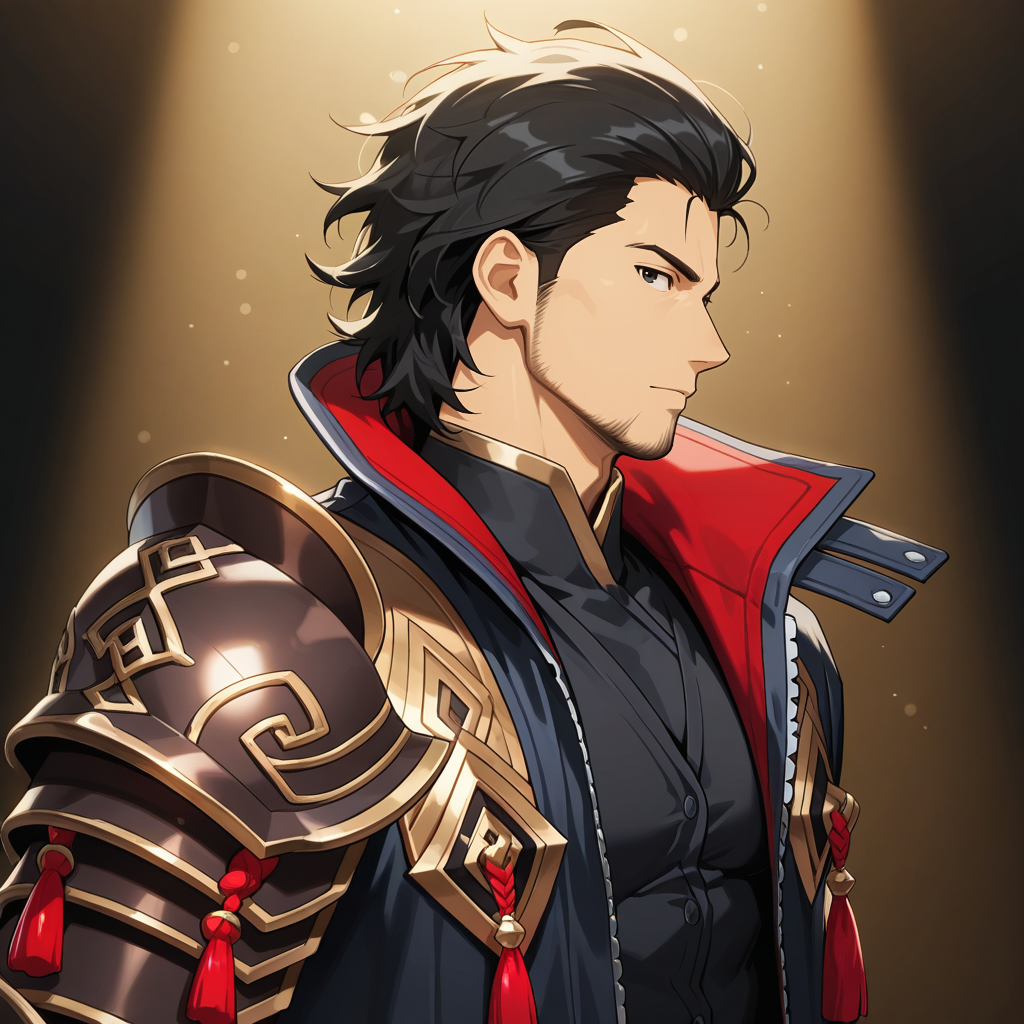 Body: black eyes, black hair, hair slicked back, messy hair, facial hair, stub