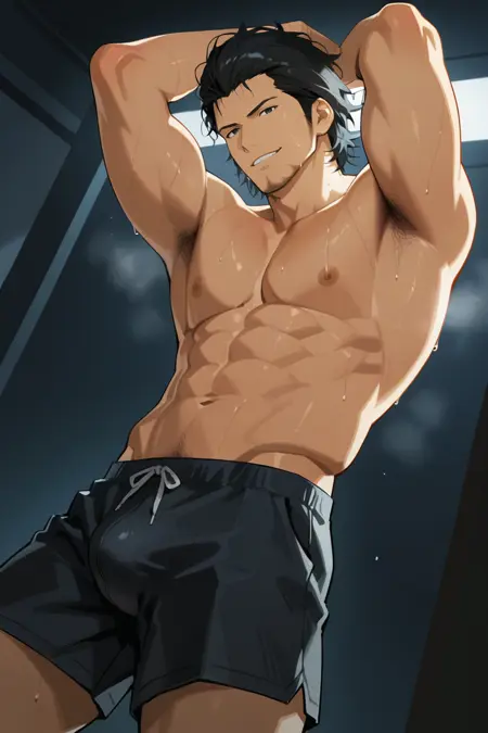 검은 눈, 검은 머리카락, 뒤로 빗어 올린 머리, 어수선한 머리, 수염, 짧은 수염
