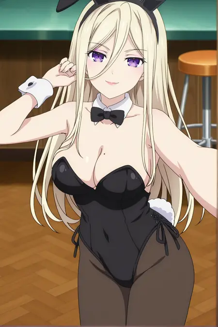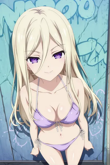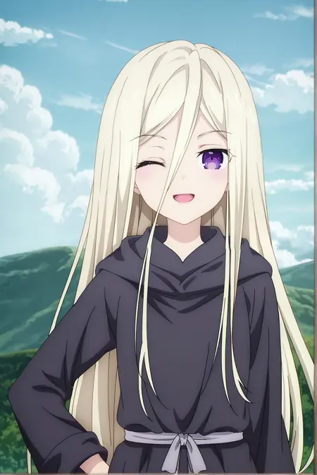 基础版:ellen,1girl,紫色眼睛,金色头发,长发,头发遮住眼睛