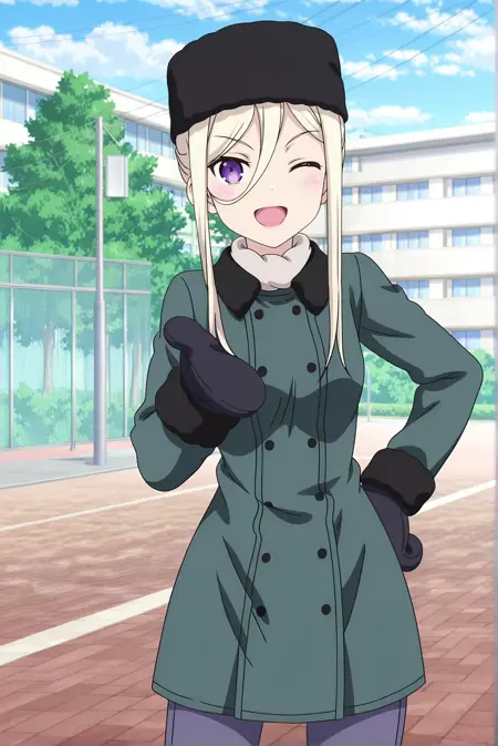 冬季版:ellen,ova1,1girl,紫色眼睛,金色头发,长发,头发遮住眼睛,盘发,绿色外套,手套,围巾,紧身裤,高筒靴,黑色帽子