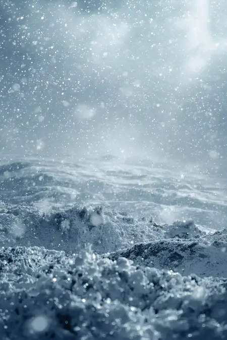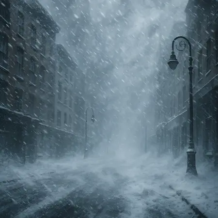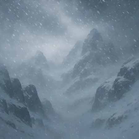 Captures wind effects on fur, clothing, and trees, snowflake chaos, and cinematic blizzard depth.