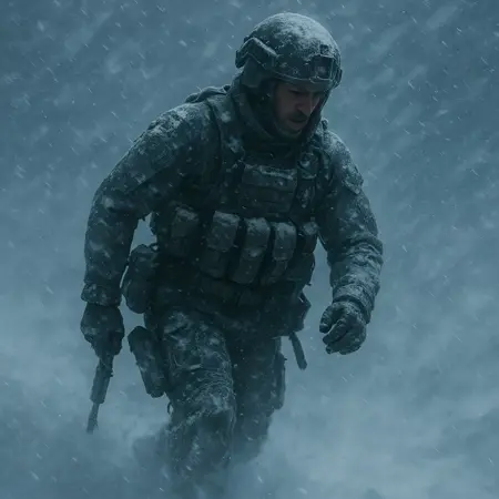 stormy_snowfall, soldier walking in blizzard, chaotic snowflakes,