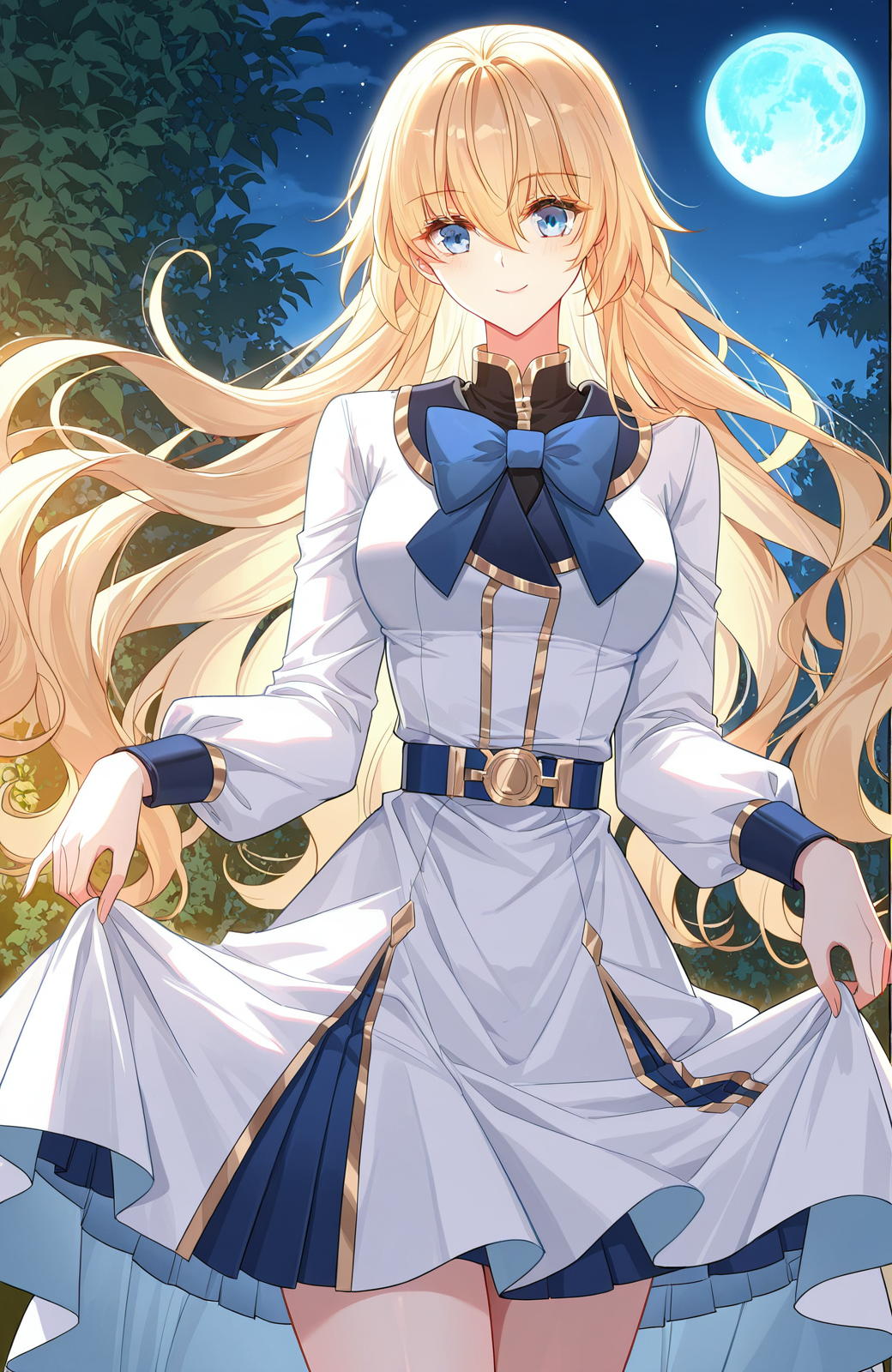 ユハンの衣装、白いドレス、長袖、 puff ソー、青いカラー、ゴールドのトリム、青いリボン、黒いインナー、ハイカラー、ゴールドのトリムのカラー、青いベルト、ゴールドのバックル、白いオーバースカート、前面スリット、青いアンダースカート、 pleated アンダースカート、