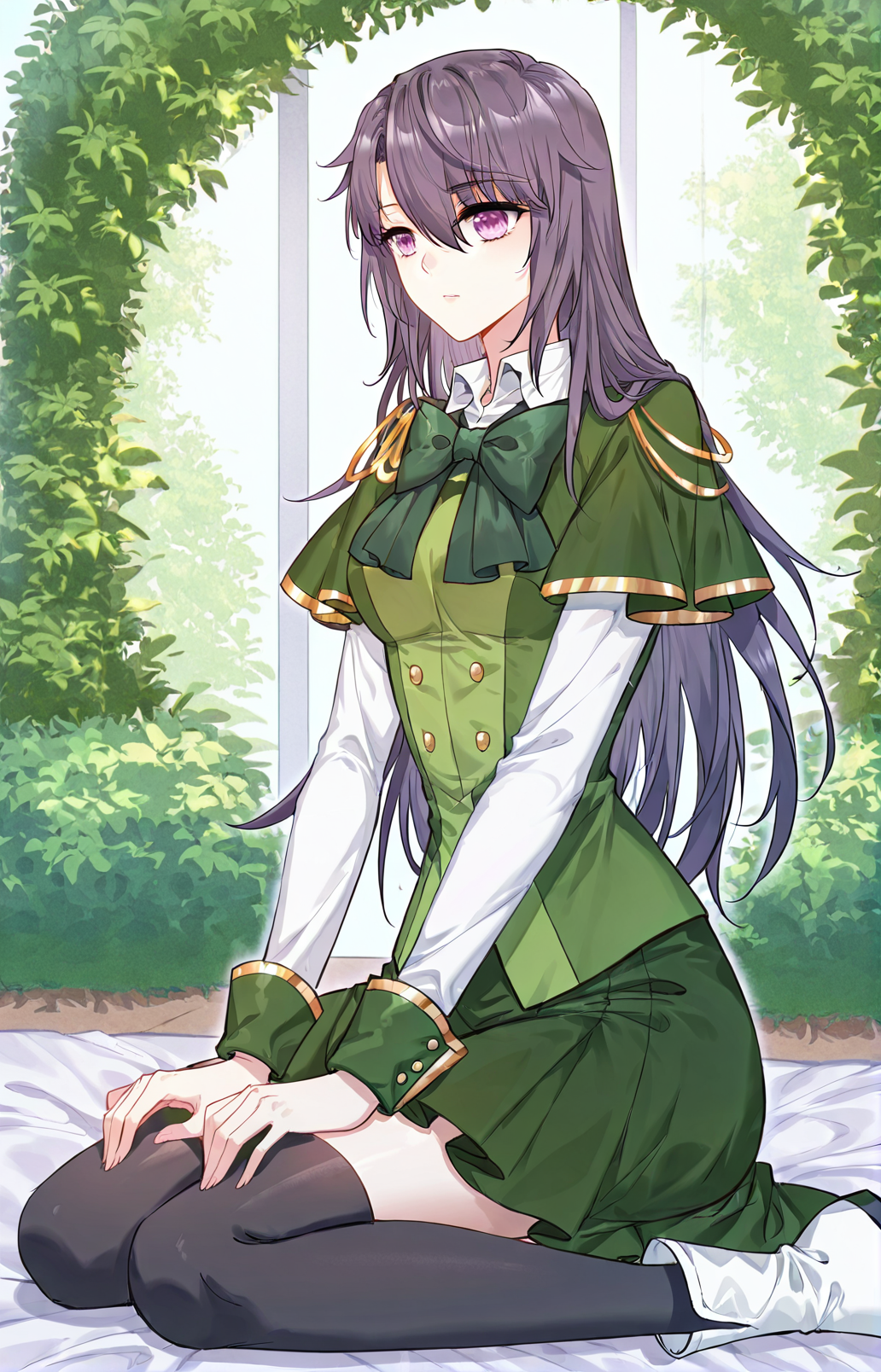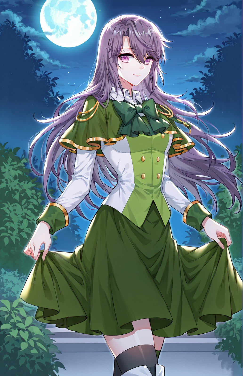 Mojueの服装、グリーンのキャップレット、ゴールドのトリム、白とグリーンのシャツ、グリーンのフロントパネルシャツ、グリーンのフロントパネル、ロングスリーブ、ふくらはぎ袖、グリーンの cuffs、カラー付きシャツ、白いカラー、グリーンのリボン、大きなリボン、ゴールドのボタン、グリーンのスカート、プリーツスカート、ショートスカート、ブラックのスルーハイ、白いブーツ、