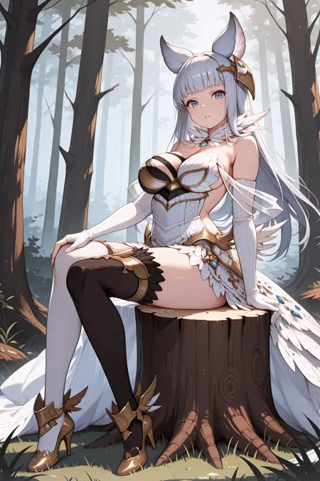 • 用于她的普通外观:添加 "defkw, animal ears, light grey hair, long hair, blunt bangs, blue eyes, hair ornament, white dress, strapless dress, feather collar, strapless, feather trim, two-tone dress, cleavage, off shoulder, see-through, white gloves, elbow gloves, single fingerless glove, asymmetrical legwear, black thighhighs, white thighhighs, gold high heels"