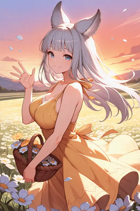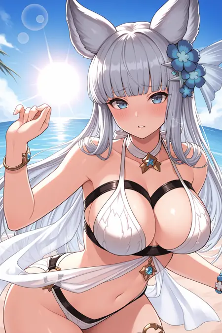 • 用于她的夏季服装:添加 "sumkw, animal ears, light grey hair, long hair, blunt bangs, blue eyes, hair flower, blue flower, pendant choker, white choker, white bikini, black harness, see-through shawl, bracelet, gold thighlet, sandals"