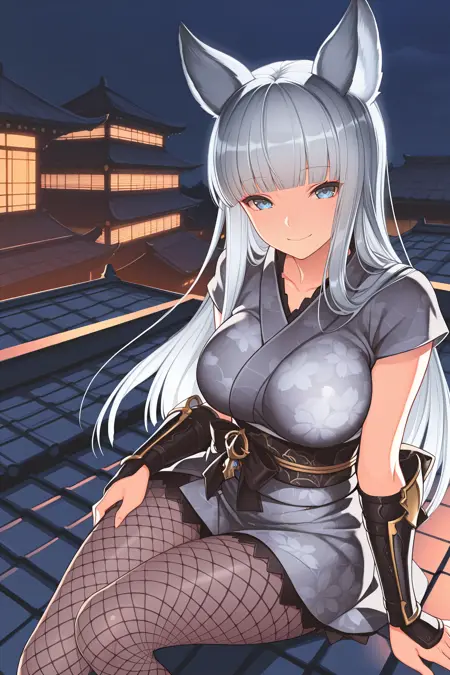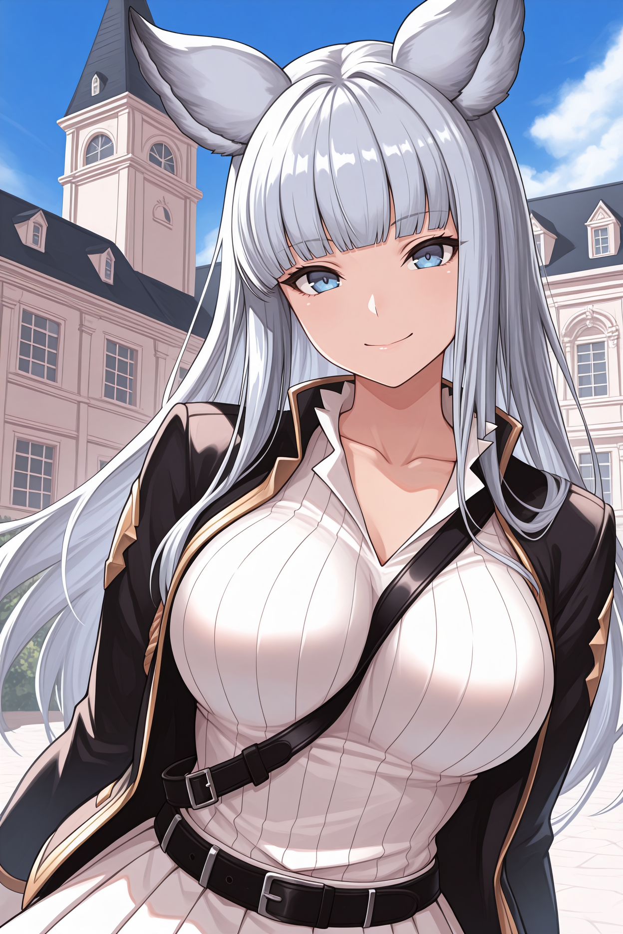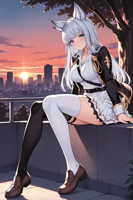 • 用于她的SR服装:添加 "altkw, animal ears, light grey hair, long hair, blunt bangs, blue eyes, collarbone, white shirt, ribbed shirt, collared shirt, white skirt, pleated skirt, black strap, black jacket, open jacket, black belt, asymmetrical legwear, black thighhighs, white thighhighs, brown loafers"