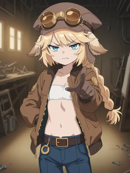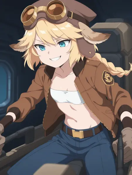 1girl, marianne, blonde hair, braided ponytail, teatan ears, animal ears, blue eyes, small, slim, petite, white bandeau, blue pants, gloves, belt, Aviator cap, pilot hat, googles on head, brown aviator jacket,