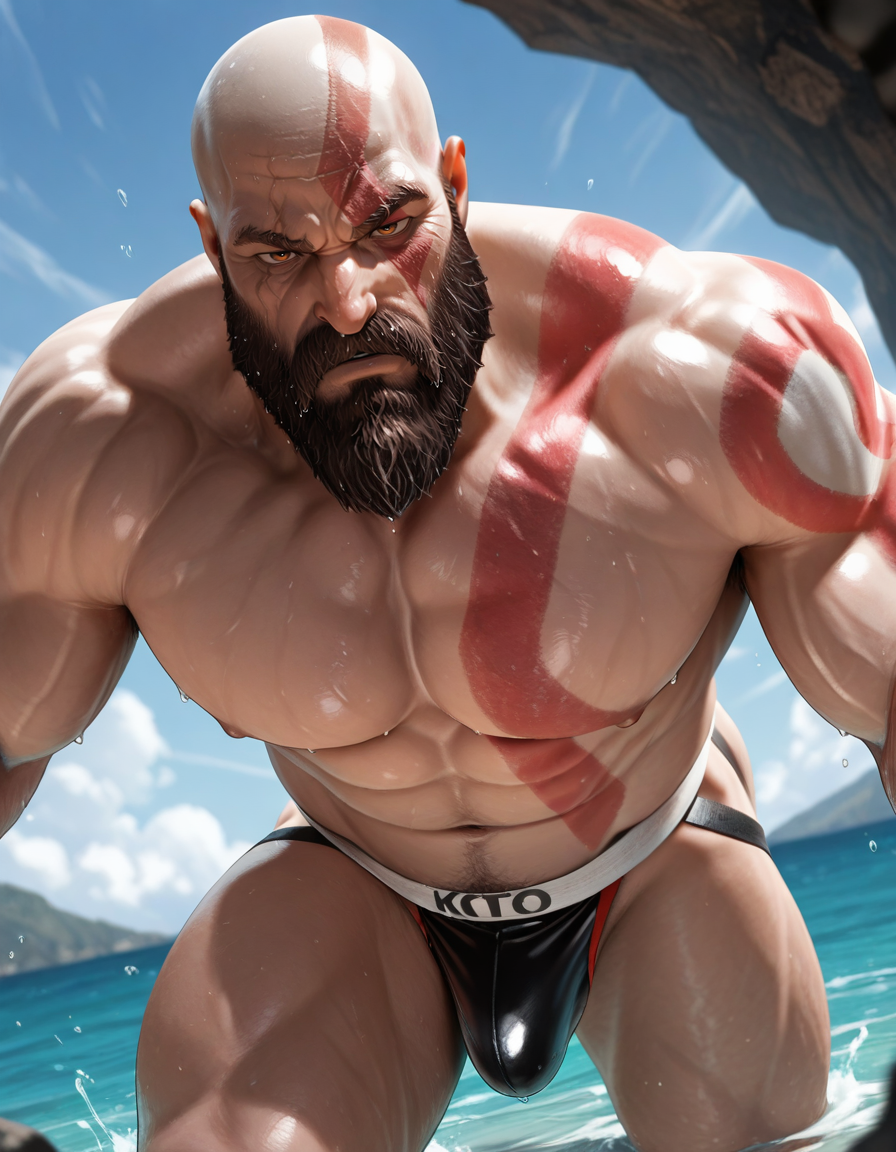 Kratos-ARAI-IL, 1boy, male focus, beard, bald, facial hair, scar, muscular