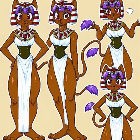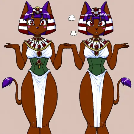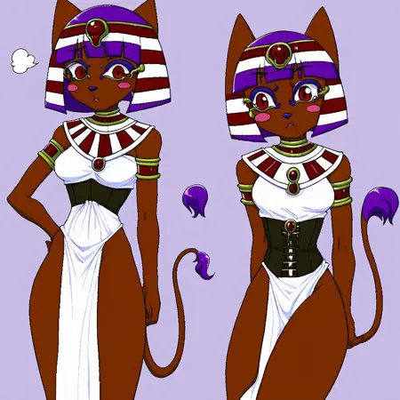 SphinxCleoP, solo, furry female, dark-skinned female, blush stickers, breasts, tail, red eyes, blush stickers, purple hair, short hair, hat, uraeus, jewelry, pelvic curtain, corset