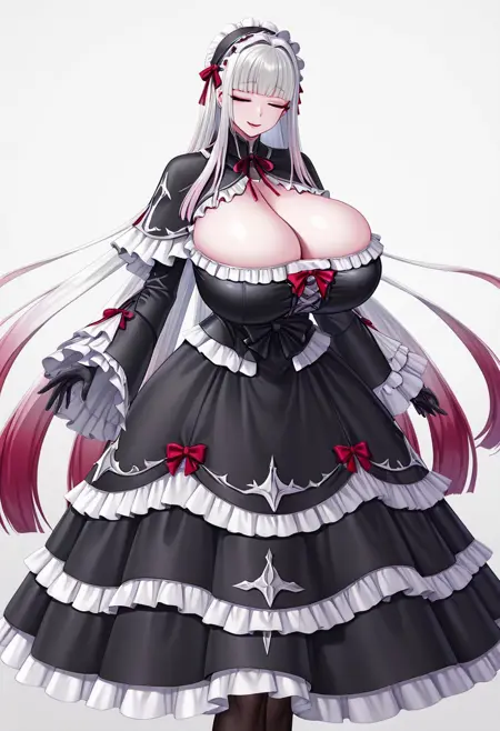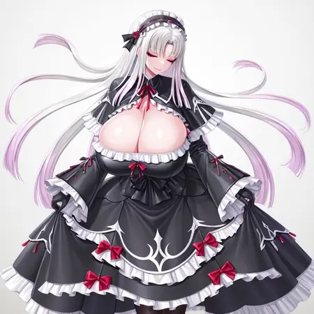TAGS : Azusa BG,frilled hairband,dress,long sleeves,frills,black gloves,black pantyhose,cleavage,bow,frilled dress,frilled sleeves,long dress,goth fashion,red ribbon,white skirt,capelet,neck ribbon,