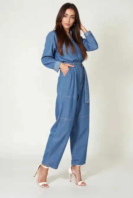 A timeless denim overall look, designed with a tailored waist, button-up front, and detailed stitching that emphasizes casual sophistication. This piece is versatile for both modern streetwear and elegant studio shoots. The look can optionally be paired with a golden handbag with a black handle, adding a luxurious accent to the outfit.