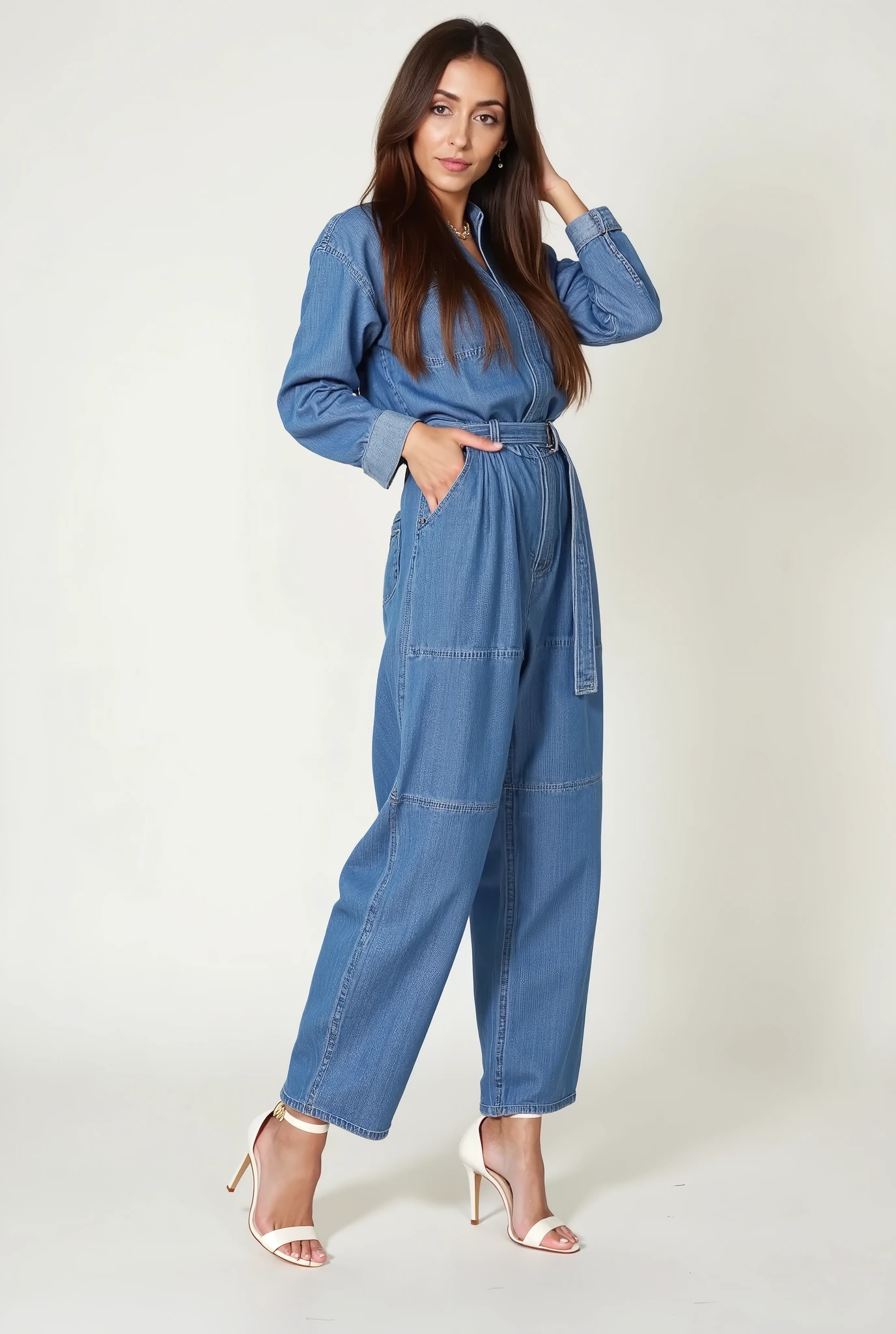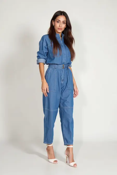 一款永恒的牛仔背带裤造型,采用修身腰线、前襟纽扣设计,并配有精细缝线,彰显随性优雅。此单品既适合现代街头风,也适用于优雅的影棚拍摄。可 optionally 搭配金色手提包配黑色手柄,为整体造型增添奢华点缀。