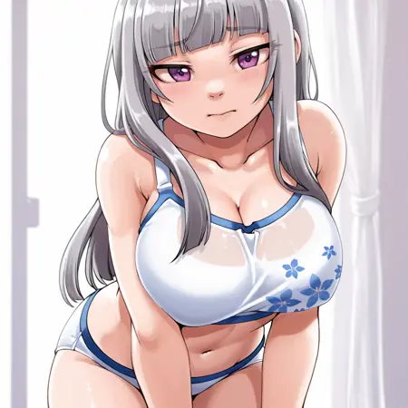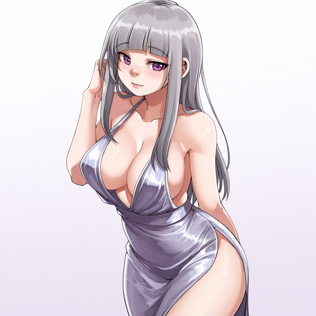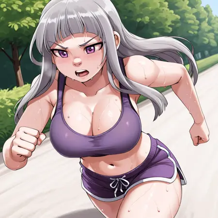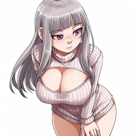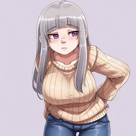 Trigger : CeshilOC, 1girl, large breasts, purple eyes, long hair, grey hair, black pants, blunt bangs, yellow and purple striped sleeves, shirt, belt, long sleeves, cowboy shot