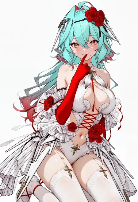 helene-default, helene 화이트 오픈 레오타드, 십자 끈 단추 복장, 할터넥, 리본, 푸석푸석한 분리형 소매, 빨간 팔꿈치 장갑, 하고로모, 코르사주, 십자 펜던트, 화이트 투벅스, 가터 스트랩, 화이트 하이힐, 쇼걸 치마