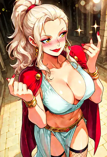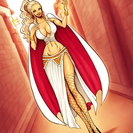EstridOP, 1girl, solo, beautiful slim woman, height woman, light hair, ponytail, long hair, makeup, lipstick, full lips, earrings, open v-neck light shirt, large breasts, cleavage, navel, midriff, groin, loose sarong, cape, wide hips, fishnets thighhighs, shoes, jewelry, bracelets, sparkle, high heels, monochrome,