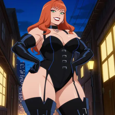 Betty_HQ, Orange_Hair, Green_Eyes, Lipstick, red lipstick, choker, black choker, dominatrix outfit, dominatrix leotard, black dominatrix leotard, elbow-length gloves, black elbow-length gloves, knee-length heel boots, black knee-length heel boots, breasts, wide hips, huge hips, huge thighs, wide body, muscular,