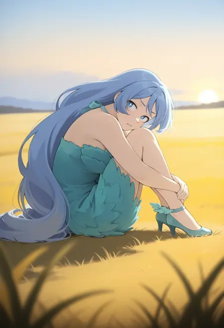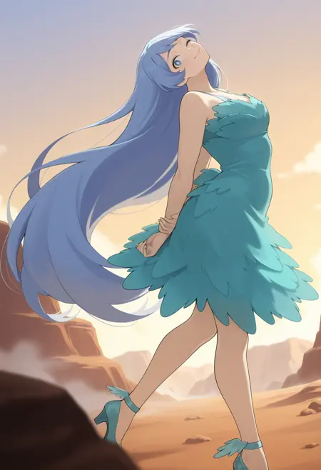 h4d0n3j1r1drss, blue eyes, bright pupils, blue hair, long hair, aqua dress, halter dress, feather dress, ankle wings, aqua footwear, high heels,