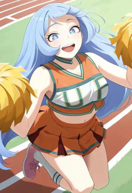 | 학습된 단어 | h4d0n3j1r1chr, blue eyes, bright pupils, blue hair, long hair, choker, multicolored clothes, orange crop top, sleeveless, midriff, navel, pleated skirt, orange skirt, microskirt, green trim, holding pom poms, pom pom (cheerleading), white socks, kneehighs, pink footwear, sneakers,복사됨! |