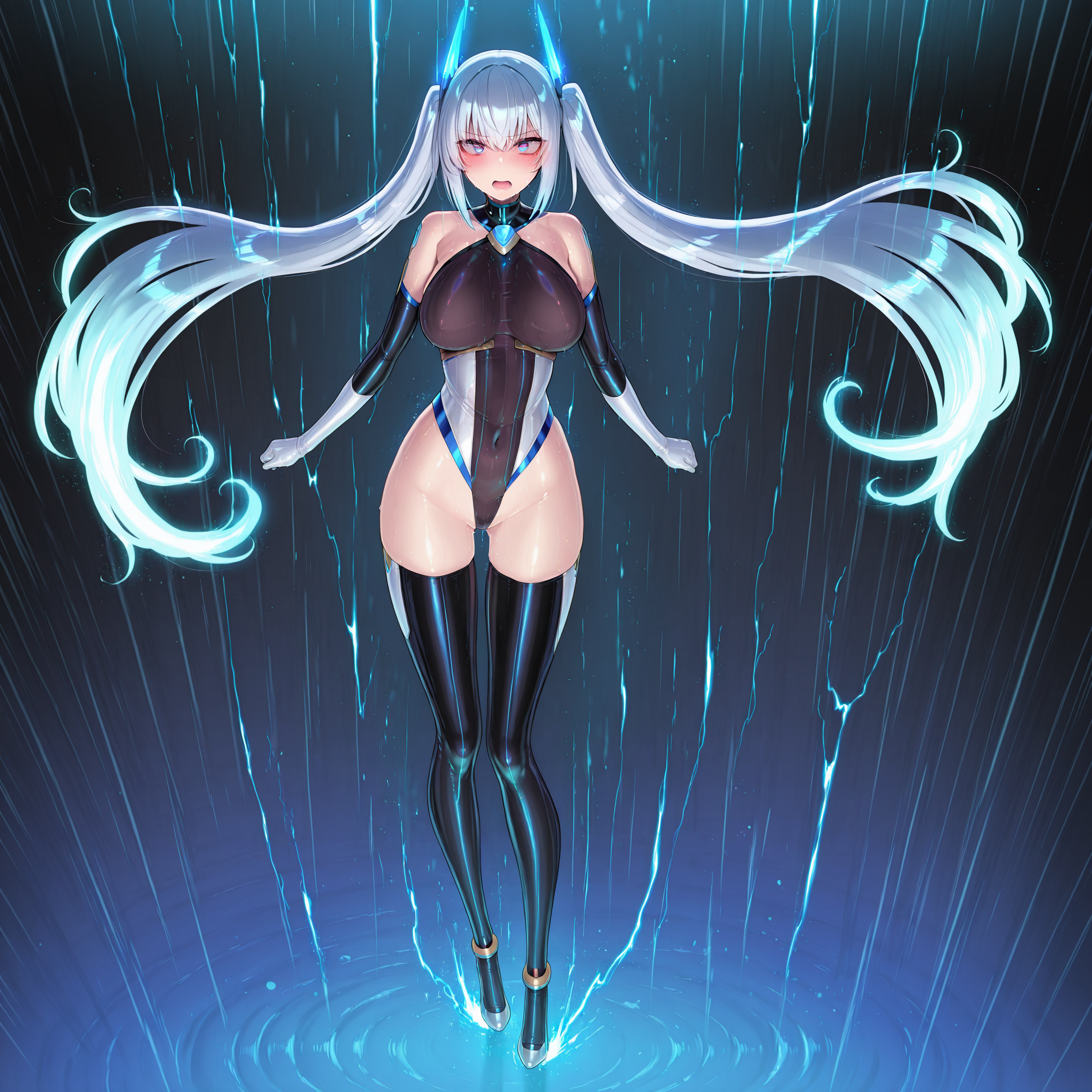 celestial extasy,Tech high socks,chest blue gem,Long gloves,High-cut tights,Silver twintails,Energy Hair Decoration,