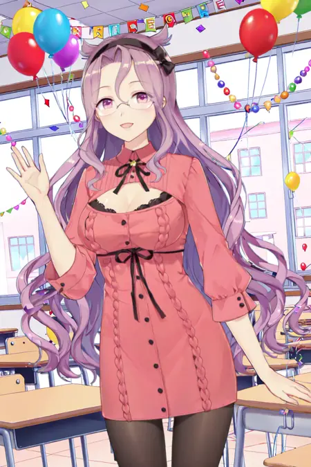 Nola·Moon \(Girl Cafe Gun\), pink collared buttoned dress with cleavage cutout, black pantyhose, black hairband, black ribbon, shrug (clothing), rimless eyewear,
