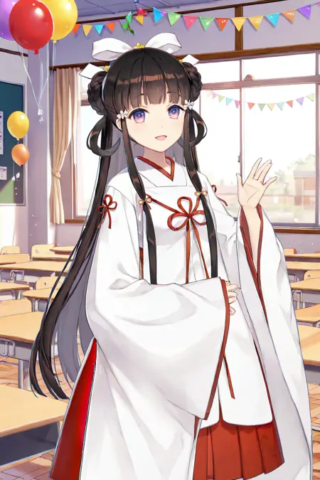 Yuki \(Girl Cafe Gun\), miko, japanese clothes, red hakama skirt, kimono, long wide sleeves, sleeves past wrists, white ribbon, red ribbon, hair ribbon, bow, <lora:gcg_AllinOne:1>