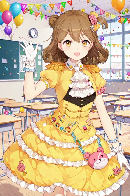 SuXiaozhen \(Girl Cafe Gun\), white gloves, yellow frilled dress, puffy short sleeves, epaulettes, frills, yellow bow, white ascot,
