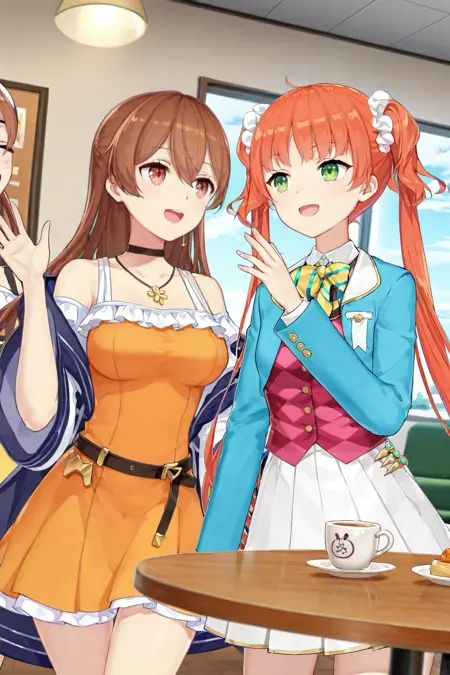 这是一个“All-in-One”模型,包含游戏《Girl Cafe Gun》中的16位主要角色。本模型使用近6万张游戏截图训练了3个epoch,仅需一个LoRA即可生成所有主要角色。几乎所有Live2D素材均包含在训练集中,因此角色没有固定服装,需通过提示词指定着装。以下是每位角色默认服装的提示词示例: