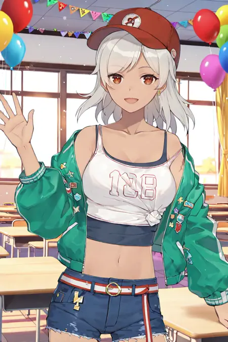 Lida \(Girl Cafe Gun\), red baseball cap, short denim cutoff shorts, cropped tank top, tied long sleeve shirt, green jacket, bare shoulders, belt, earrings, <lora:gcg_AllinOne:1>