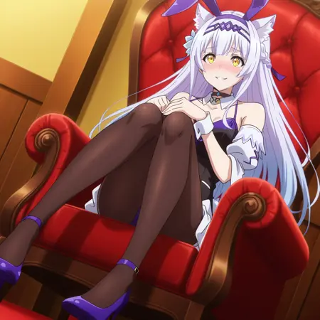 SRAClaire, purple hair, long hair, animal ears, black choker, yellow eyes, hairband, cat ears, animal ear fluff, hair ornament, white hair flower, braid, hair ribbon, sidelocks,
